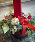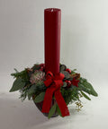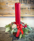 Elegant juledekoration med høj rød lys Smuk og klassisk juledekoration med et højt rødt bloklys, omkranset af vintergrønt, eucalyptus, hyggelige naturmaterialer og røde julekugler. Dekorationen...