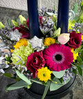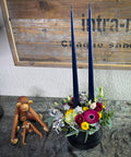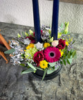 Multifarvet hatteæske med friske blomster og lys – en dekorativ og stemningsfuld løsning til nytårsbordet eller stuen. Et flot alternativ til traditionel borddekoration og velegnet som værtindegave. Foret med plast for optimal holdbarhed. Blomster og farver kan variere.