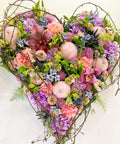 Send et sidste farvel med et smukt, lukket hjerte i pastelfarver, dekoreret med elementer fra naturen, som giver hjertet en let og naturlig elegance. Hjertet er sammensat af sæsonens blomster. Størrelsen varierer efter valgt pris. Billedet viser et hjerte på ca. 38 cm.