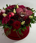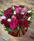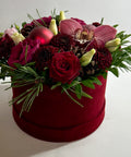 Sød hatteæske med afskårne blomster i mørkerøde nuancer, arrangeret i oasis med et smukt hjerte i midten. Perfekt som et alternativ til en julebuket. Den...